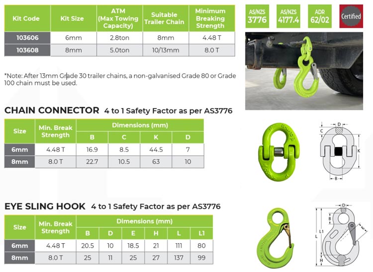 The kits are available in two sizes, each with different working load limits (WLL), breaking forces, and chain size compatibility, ensuring that they meet the towing requirements for various Aggregate Trailer Masses (ATM):